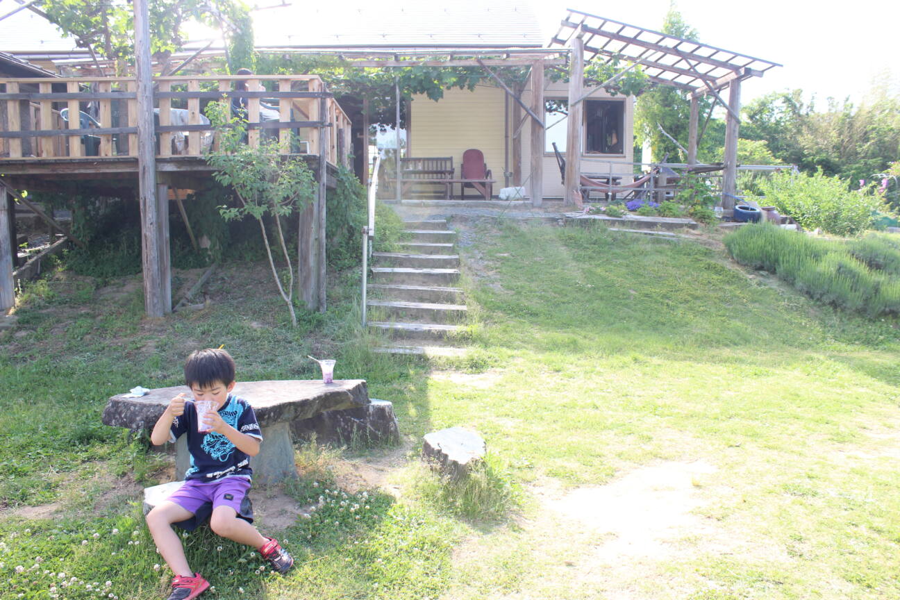自家栽培のブルーベリーをたっぷり使ったジュースやソフトクリームが人気のカフェ。屋外のイートインスペースには、ヤギの小屋があり、かわいいヤギたちにエサやり(有料の固形エサあり)ができます。園内にはハーブや花があちらこちらに咲いていて、緑豊かな自然に囲まれたくつろいだ時間が流れています。