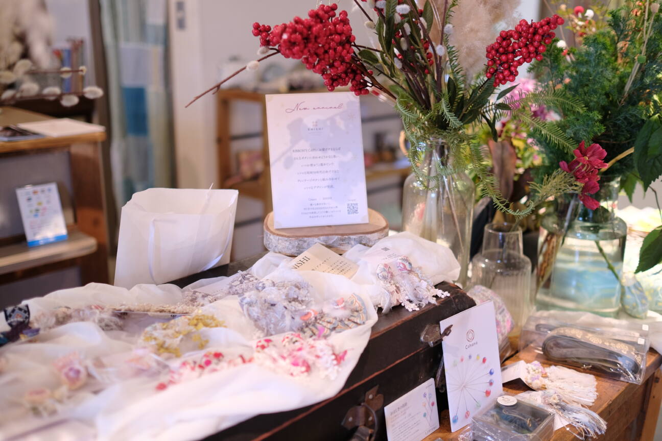 棚一面に並ぶ約800種類の可愛いチロルリボンやハンドメイド作家さんの作品、セレクトした小物雑貨なども販売しており、併設のミシンスペースにはフリープランと有料のサポートプランがあるので、その場ですぐに作品づくりを楽しむことができます。