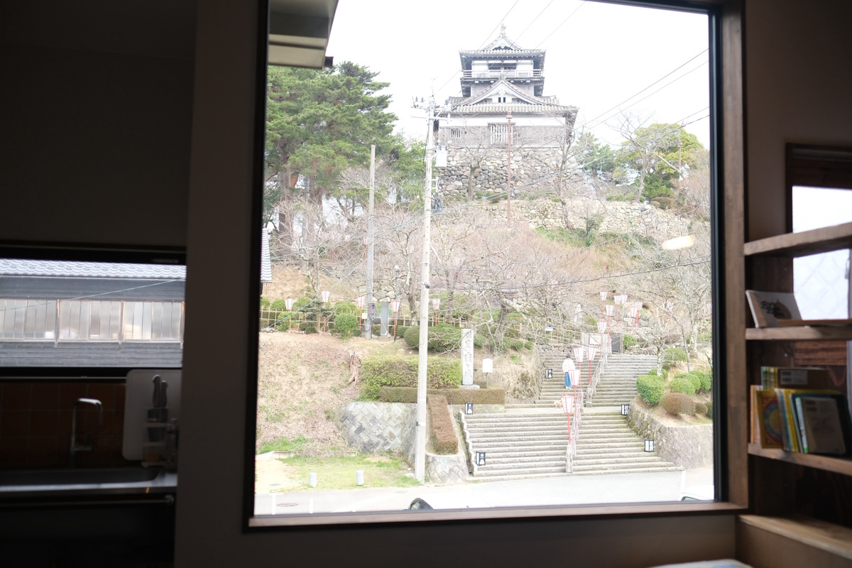 大きな窓から望む、丸岡城の天守!
